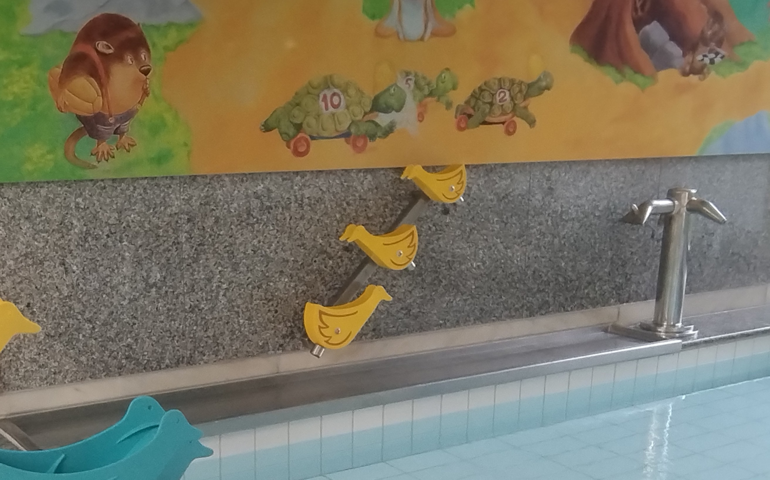 Interaktive Enten-Wippe, stabil, sicher, vandalismusfest und leicht zu reinigen. Die Duckslide bleibt auch bei hoher Besucherfrequenz zuverlässig im Betrieb, für Wandmontage mit 3 Enten. Farben: gelb/ orange/ blau gemischt