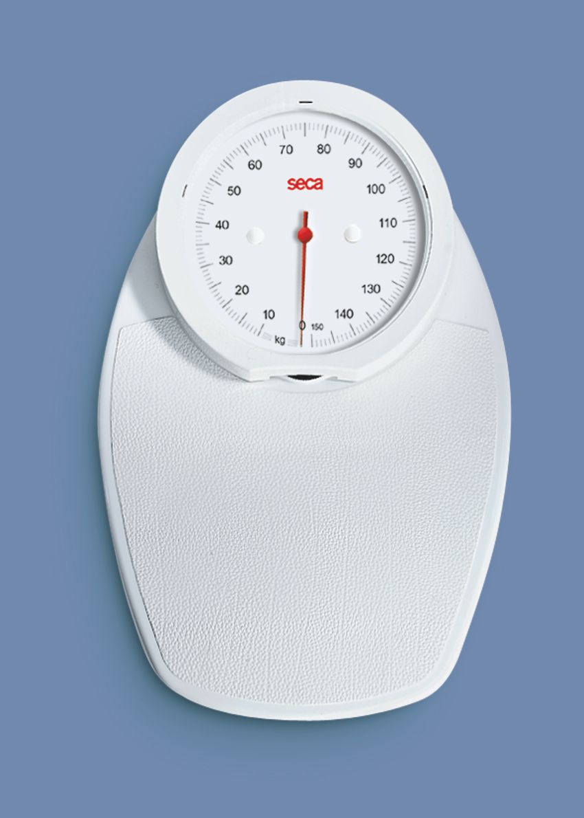 Mechanische Personenwaage mit Kreiszeigerskala, Nullstelleinrichtung, Kunstleder-Trittfläche, max. 150 kg, 1.000 g Teilung.
