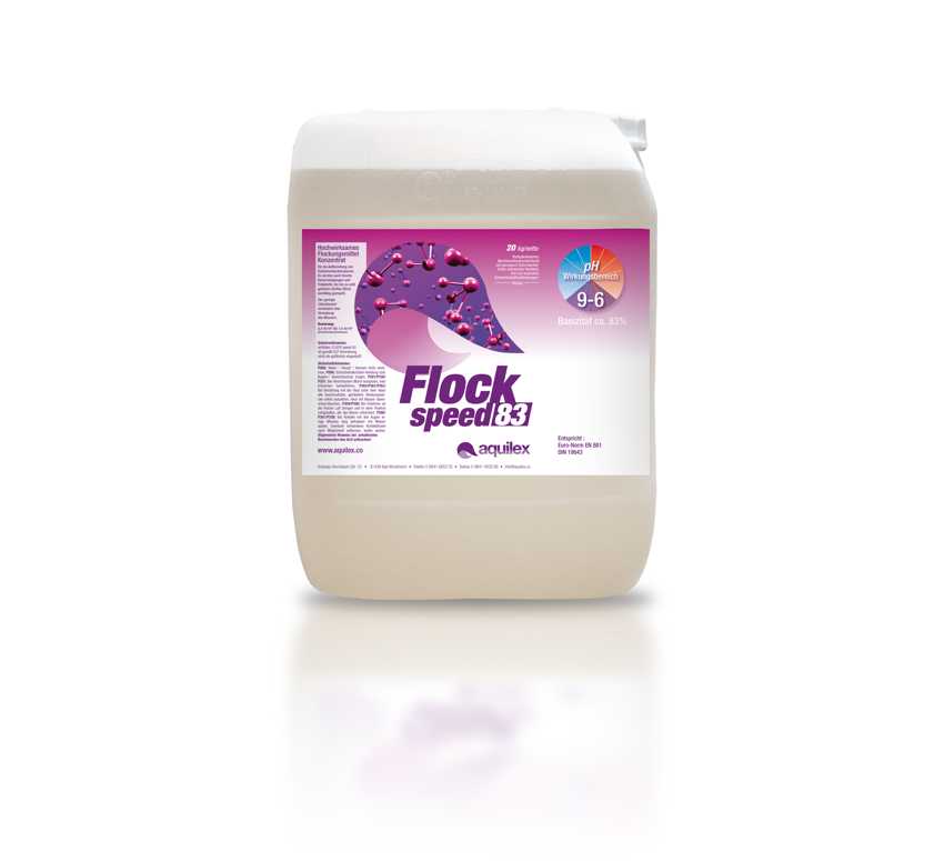 Durch die Vorhydrolyse von FLOCK SPEED 83 wird eine schnelle Flockenbildung erreicht. Der geringe Chloridanteil verhindert zum einen eine Versalzung des Wassers und begründet zum anderen das breite Wirkungsspektrum in einem pH- Bereich von 6-9.