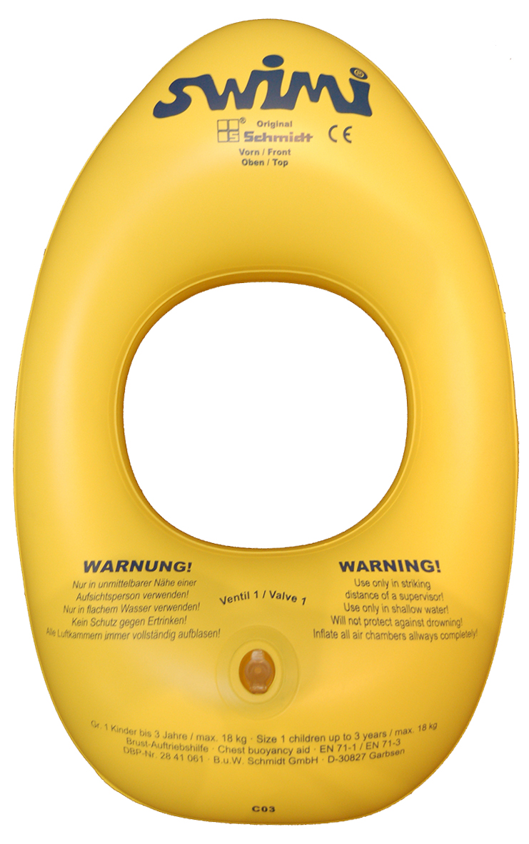 Speziell geformte Brust- Auftriebshilfe, wird verwendet um Kinder bis zu einem Alter von 3 Jahren mit der Wasserumgebung vertraut zu machen. Er besitzt eine innere und äußere Luftkammer mit je einem versenkbaren Kunststoffventile mit Verschlussstopfen und Rückschlagverschluss.